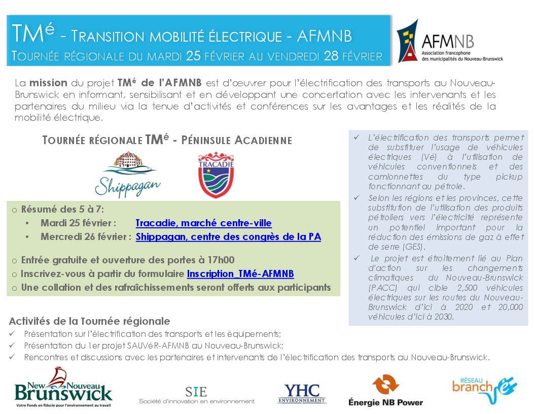 La Ville de Shippagan tient à inviter la population à la tournée transition mobilité électrique organisée par Association francophone des municipalités du N.-B. qui aura lieu au Centre des congrès de la Peninsule Acadienne le mercredi 26 février de 17 h à 19 h.