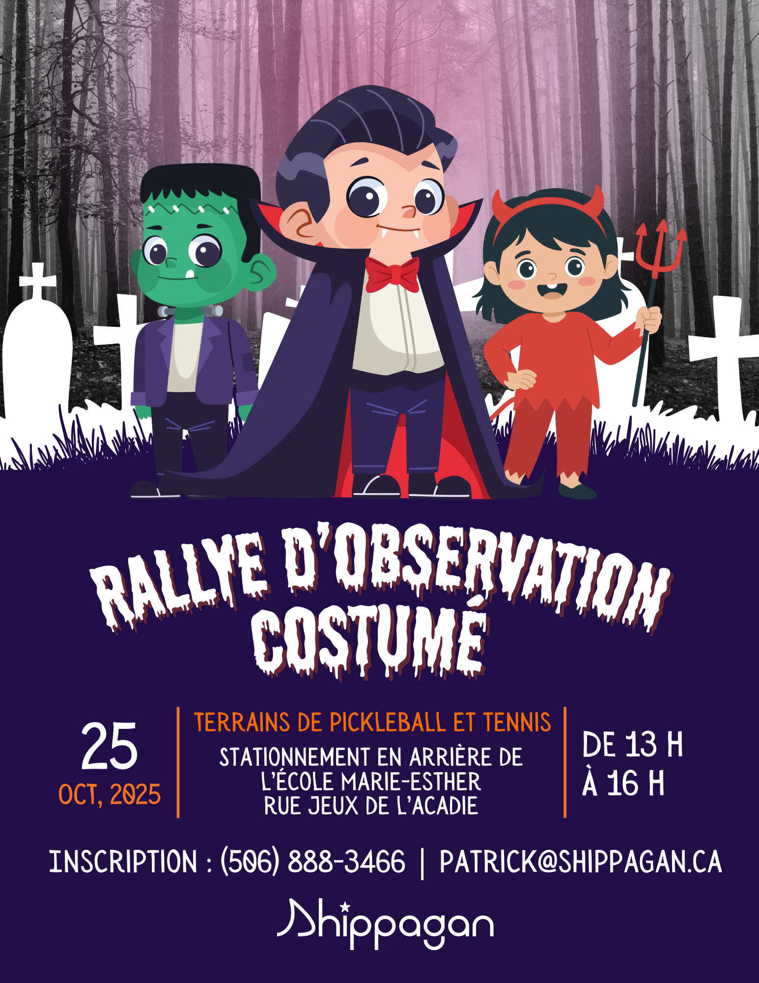 Les équipes de 2 à 6 personnes peuvent s’inscrire par téléphone au (506) 888-3466 ou par courriel à patrick@shippagan.ca. Ne pas oublier de préciser le nombre d’enfants ainsi que le nombre d’adultes dans votre équipe.